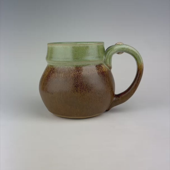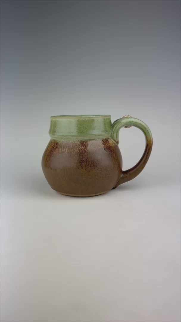 This mug was thrown on Klayton’s handmade treadle wheel that was given to him by a friend. Powered by pumping his foot rather than simply pressing the pedal on his usual electric wheel, Klayton has a different experience making these mugs. In order to differentiate them from his typical mugs, he treats the bottoms with this unique design created by a special cut wire. This gives it a more spontaneous, less refined look that is too textured to stamp with the usual logo.