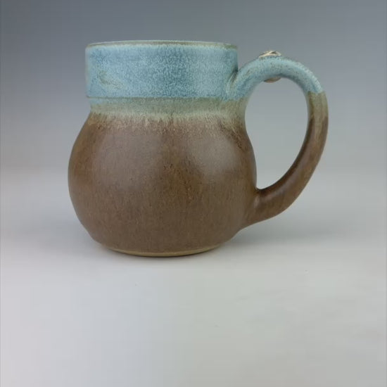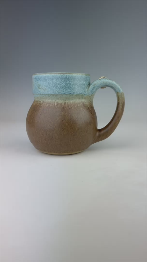 Meet Billy. His recurved body style keeps your beverage warm and keeps him looking hot. The contrast between his blue and brown glazes show off the form well. His marble showcases stoneware, black, and white with subtle splashes of color. A slight bump in his glaze and a small chip under his handle (see video) are fairly negligible imperfections, but discount worthy nonetheless.
