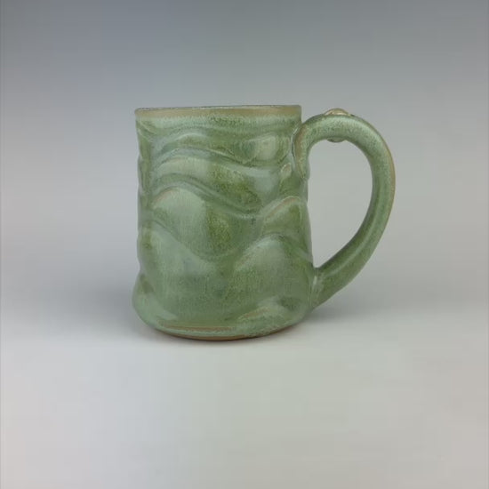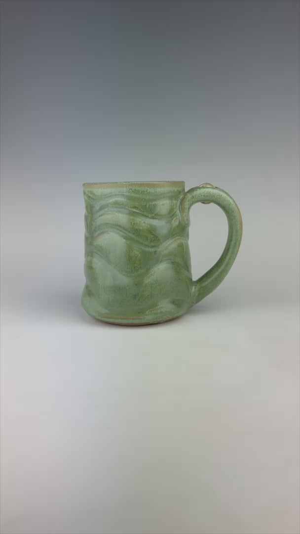 This mug was thrown on Klayton’s handmade treadle wheel that was given to him by a friend. Powered by pumping his foot rather than simply pressing the pedal on his usual electric wheel, Klayton has a different experience making these mugs. In order to differentiate them from his typical mugs, he treats the bottoms with this unique design created by a special cut wire. This gives it a more spontaneous, less refined look that is too textured to stamp with the usual logo. On this mug, he impressed the logo design into the side of the bottom, which pooled nicely with glaze.
