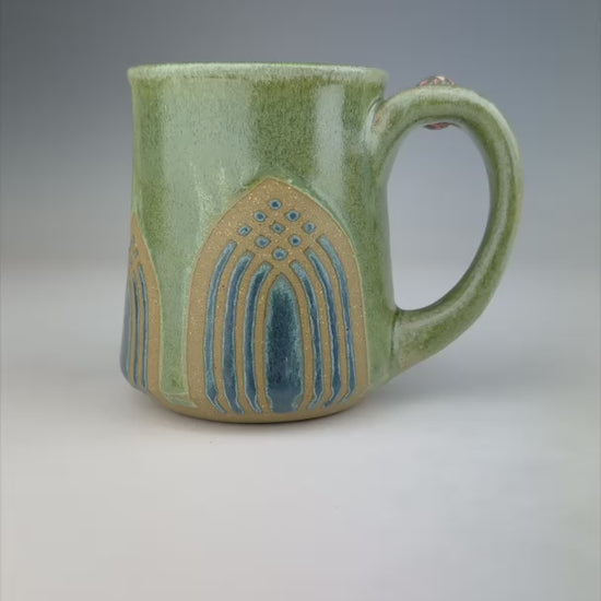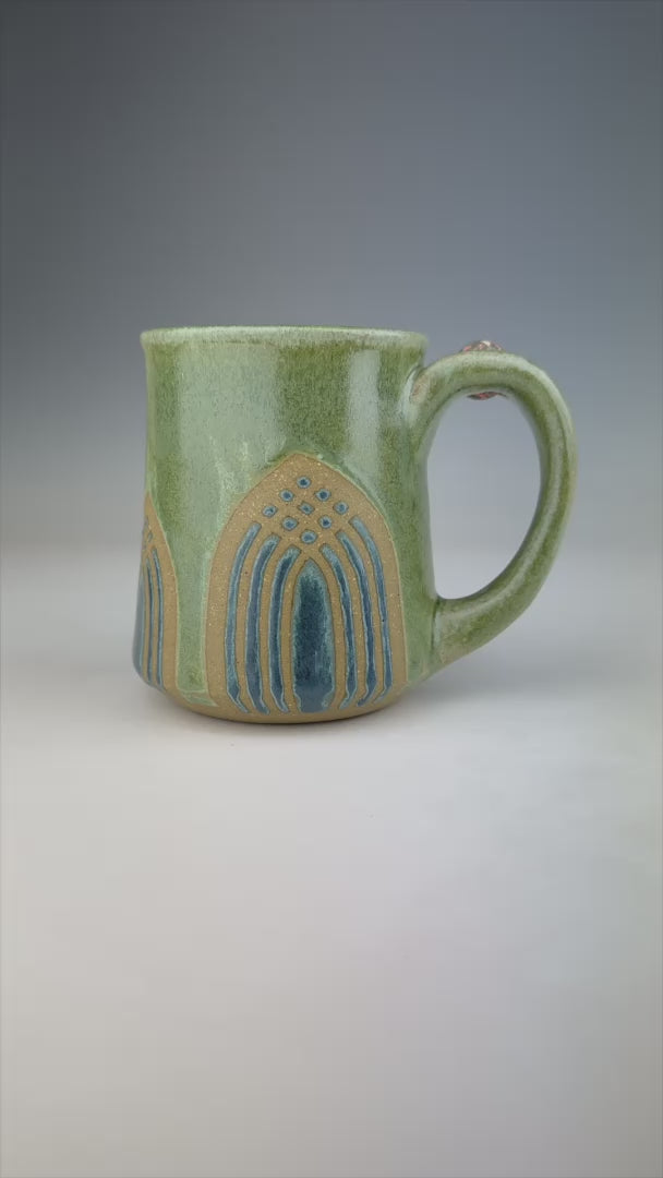 Meet Charlotte. Her green and blue surface design evokes visions of tall cathedrals surrounded by fanciful windows. Her marble is equally grand with stoneware, black, white, and lots of bright pink.