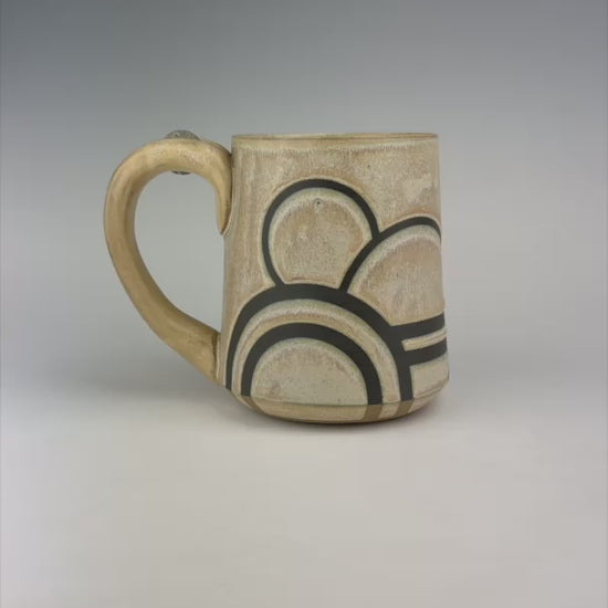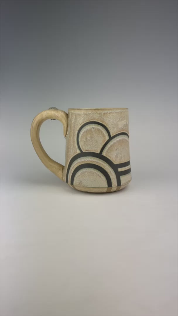 Cosmo's unique surface design was achieved by utilizing vinyl tape as a mask, carefully applied by Molly. The tape is removed after the glazing process to reveal the black slip underneath.