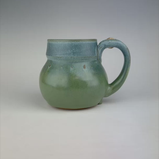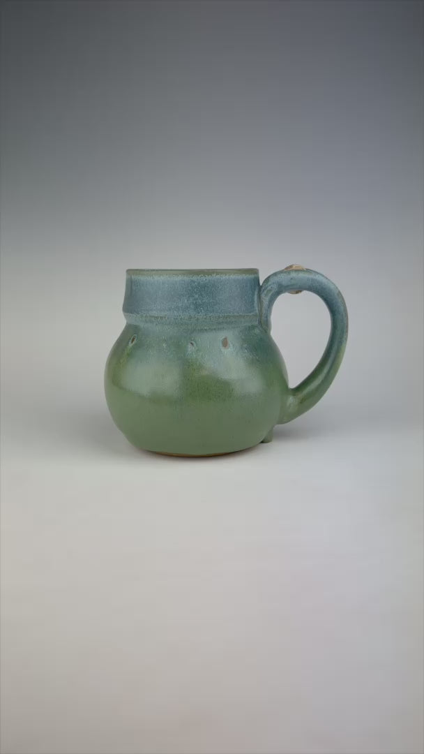 This mug was thrown on Klayton’s handmade treadle wheel that was given to him by a friend. Powered by pumping his foot rather than simply pressing the pedal on his usual electric wheel, Klayton has a different experience making these mugs. In order to differentiate them from his typical mugs, he treats the bottoms with this unique design created by a special cut wire. This gives it a more spontaneous, less refined look that is too textured to stamp with the usual logo. On this mug, he impressed the logo design into the side of the bottom, which was completely filled in by the thick glaze application. If you look closely, you can see a slight ghost image of the logo to the side of the handle at the bottom of the mug.