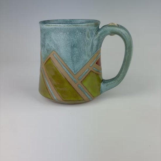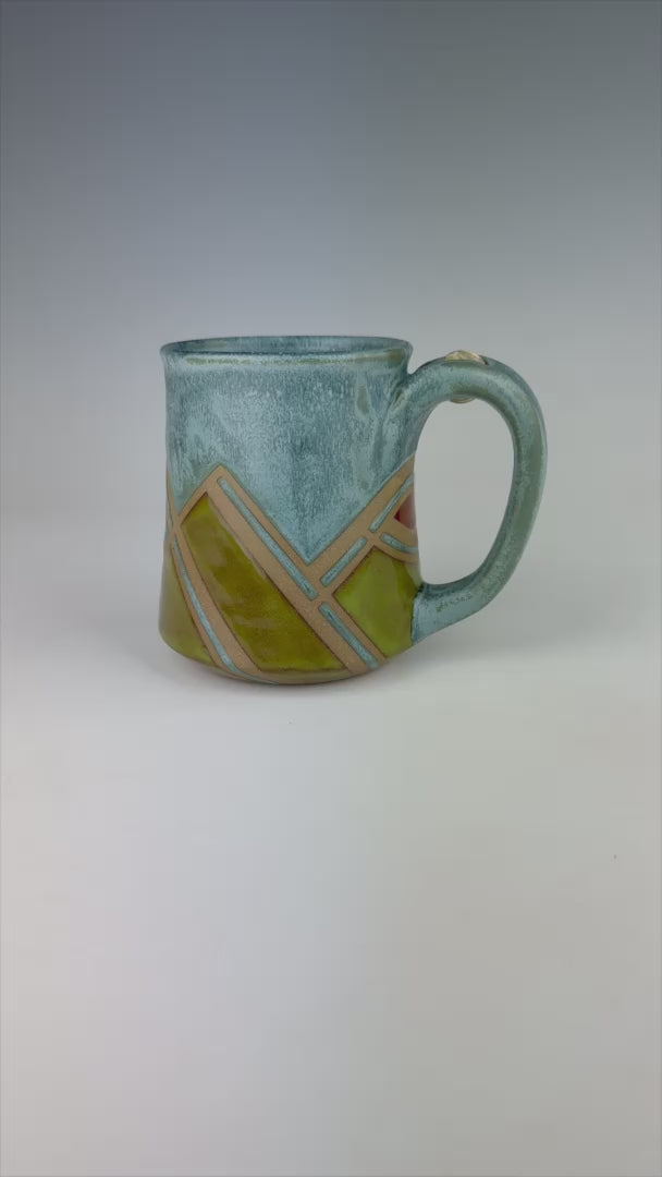 Meet Miranda. In a display of speckled, satin blue, matte stoneware, and shiny green and brown, Miranda's attire is anything but ordinary. Her ensemble is a one-of-a-kind design by Molly, and she has a very nice, colorful marble that sits happily in her handle.