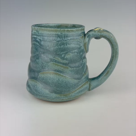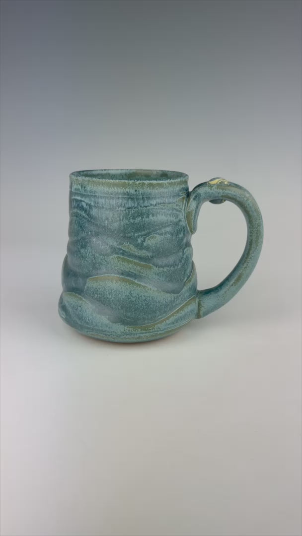 Meet Teddy. Like an endless ocean of shimmering, blue waves, his rippling form just won't quit. His blue and yellow marble floats like a desert island atop his blue handle.